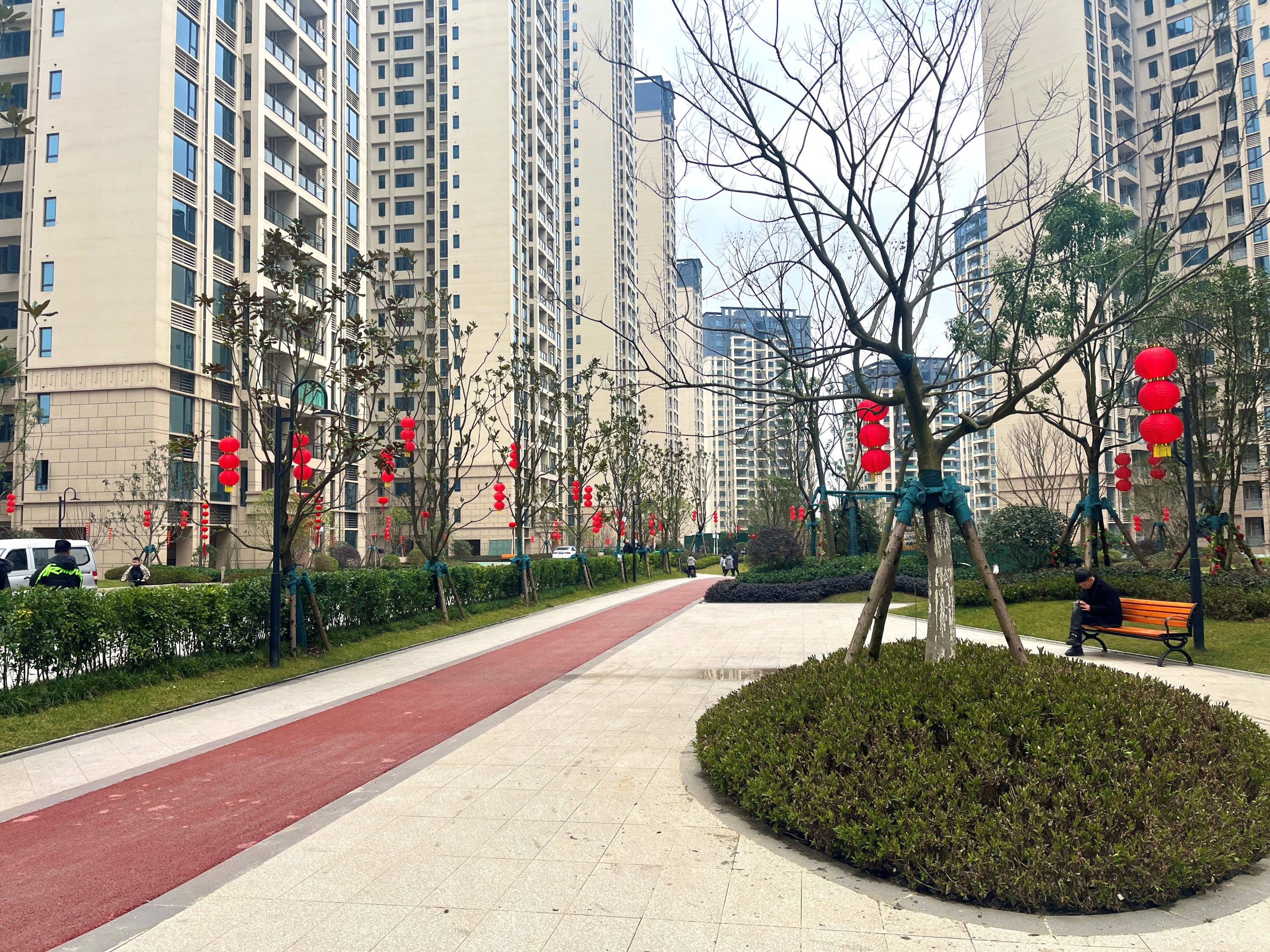 交付当天,收房区红毯盛装以待,现场处处洋溢着“欢迎回家”的喜庆气氛。火红的灯笼、欢迎回家的字样,交付现场的每一处场景都做了精心的布置。走在春意盎然的新苑区,一幢幢住宅楼和园林景观映入眼帘,迎宾景观大道上温馨的标语、整洁的道路,烘托出了业主收房的喜悦。