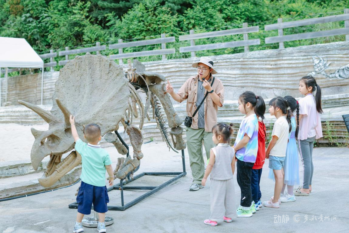 当记者来到贵阳市清镇的侏罗纪恐龙小镇古生物科普研学基地时,讲解员正带着研学团队的小朋友们参观模拟考古学家户外发掘古生物化石的展馆。
