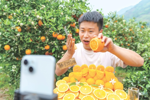 秭归县是脐橙生产大县,脐橙也是全县主导富民产业。眼下,正是春季脐橙成熟时节,果农采用无人机吊运脐橙,通过电商直播销售脐橙,助力高效采收销售,大幅节省劳动力,缩短脐橙从枝头到消费者手中时间,提升农业生产效率,促进农民增收。周仕伟 摄(来源:大国三农)
