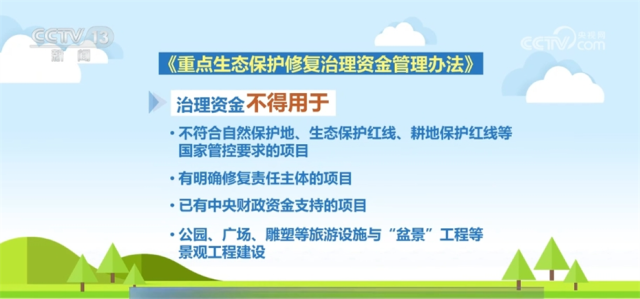 与此同时,新办法规定了治理资金不得使用的范围,比如不符合自然保护地、生态保护红线、耕地保护红线等国家管控要求的项目,有明确修复责任主体的项目,已有中央财政资金支持的项目,公园、广场、雕塑等旅游设施与“盆景”工程等景观工程建设。