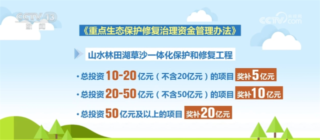 资金具体怎么分配?新办法指出,山水林田湖草沙一体化保护和修复工程总投资10亿元—20亿元(不含20亿元)的项目奖补5亿元;工程总投资20亿元—50亿元(不含50亿元)的项目奖补10亿元;工程总投资50亿元及以上的项目奖补20亿元。历史遗留废弃工矿土地整治总投资5亿元及以上的项目奖补3亿元。