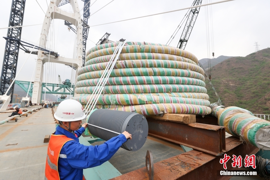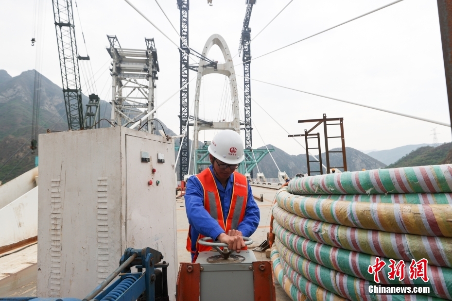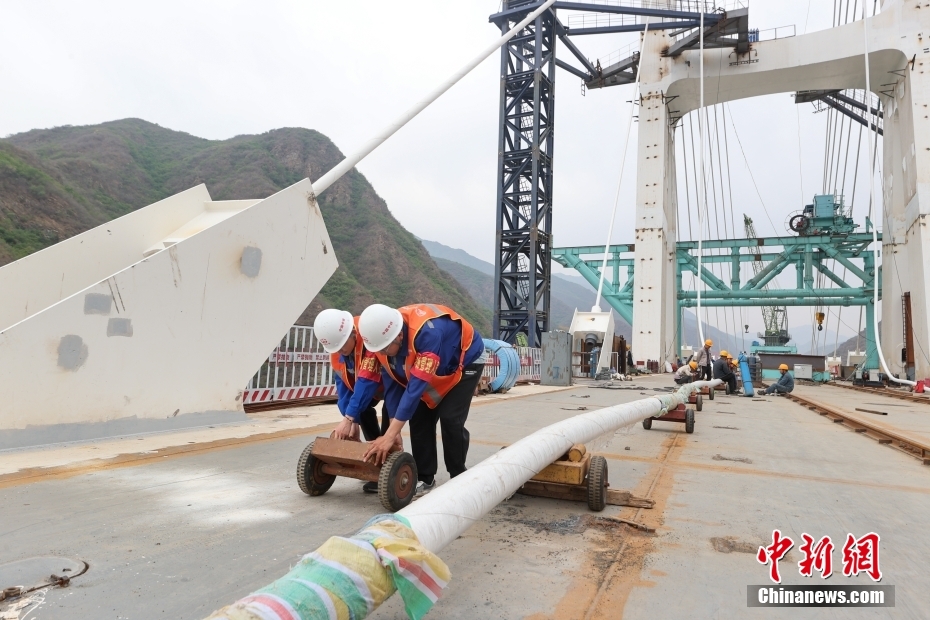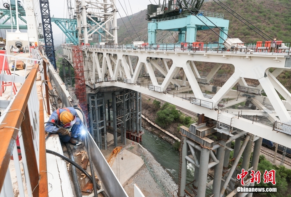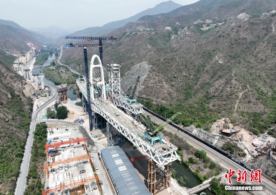 5月12日,北京门头沟,航拍建设中的国道109新线高速公路安家庄特大桥。该桥跨越丰沙铁路、永定河及109国道,是国内首例墩顶双幅同步转体曲线钢桁梁斜拉桥梁,预计今年年底前具备通车条件。(无人机照片)