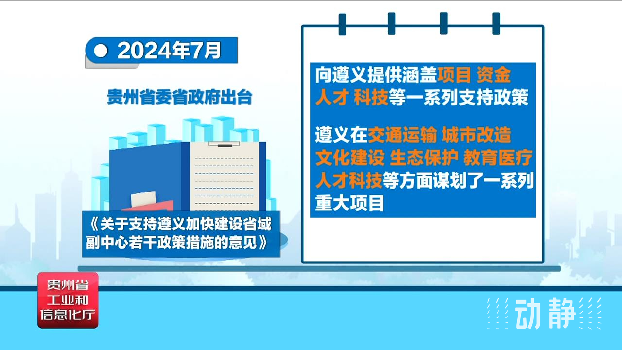 2024年7月,省委省政府出台《关于支持遵义加快建设省域副中心若干政策措施的意见》,向遵义提供涵盖项目、资金、人才、科技等一系列支持政策。为用好用足支持政策,遵义在交通运输、城市改造、文化建设、生态保护、教育医疗、人才科技等方面谋划了一系列重大项目。目前,遵义市已谋划储备重大项目290个,总投资4800多亿元,已开工项目155个,已完成投资600多亿元。