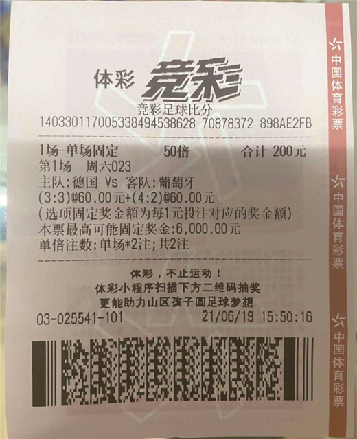 王先生说,6月19日下午3时50分左右,他在鹿城区新田园的一家彩票店购买了一张“体彩,竞彩足球比分”的彩票,彩票合计为200元。昨天凌晨,这张体育彩票所对应的足球赛结束,王先生得知自己的彩票已中奖。兴奋之余,他将彩票拍了照片发到微信朋友圈,以表达自己的喜悦。