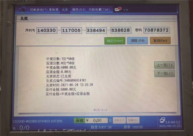 而昨天下午,当王先生再次来到新田园的彩票店时,店主告诉他这张彩票已兑奖。根据彩票店电脑显示,王先生的这张彩票中奖金额6000元,兑奖状态为“已兑奖”,兑奖时间为昨天中午12时26分20秒。但是,至于在哪里兑奖,该彩票店电脑系统无法显示,只显示兑奖点编号为5406096934101。