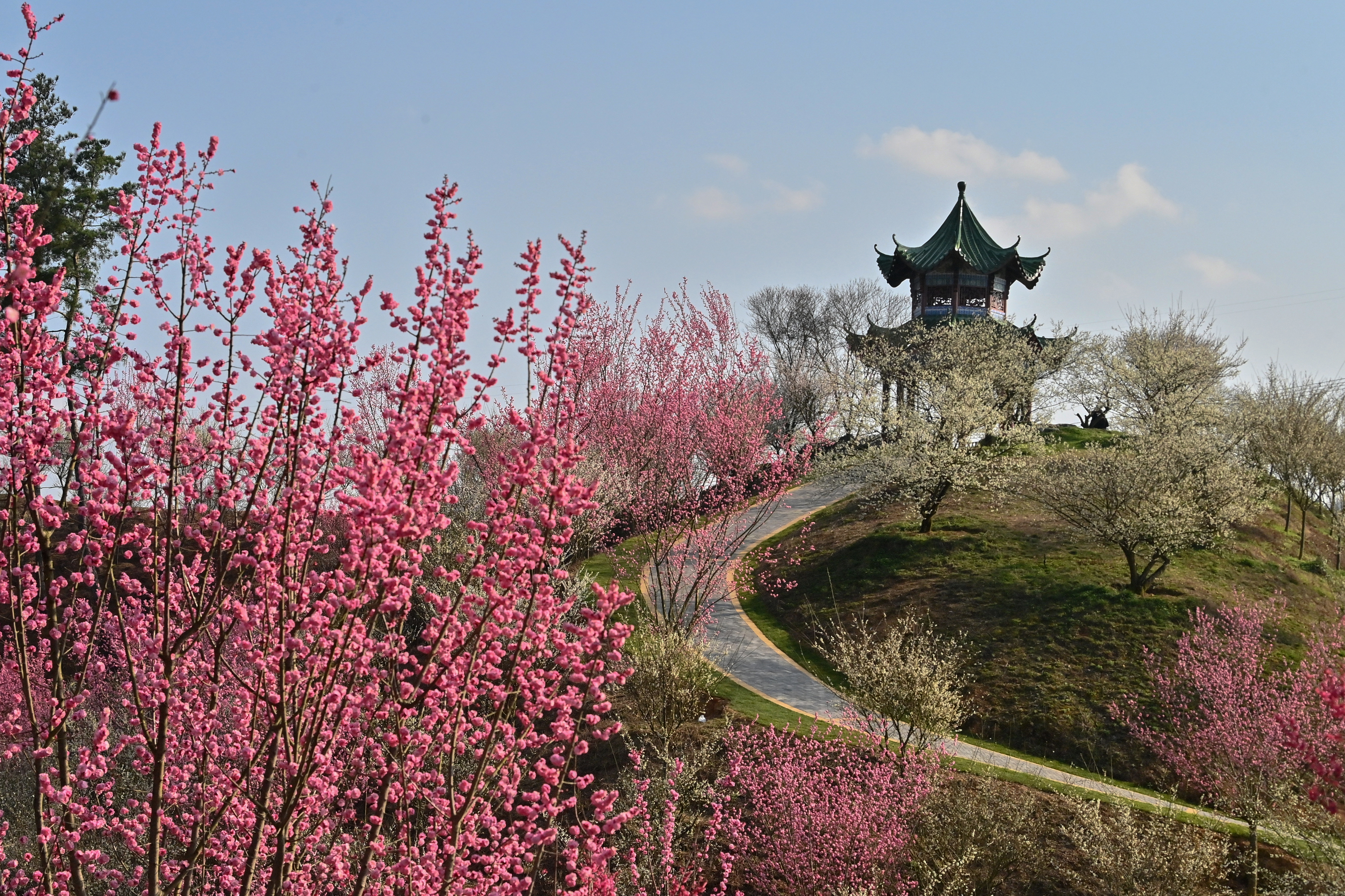 近日,贵安新区贵州梅园内春意盎然,一簇簇红梅花、白梅花竞相绽放,吸引众多游客前来赏梅观光。
