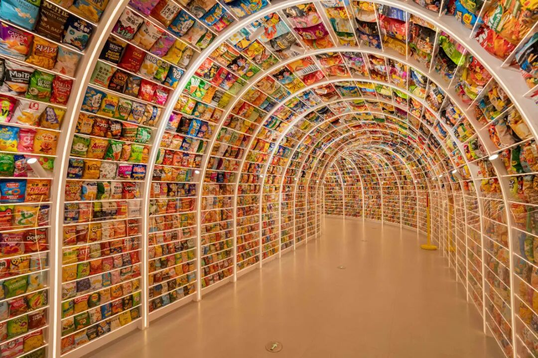 在空间布置上,除“水饮小镇”“糖果森林”“辣条秘境”“零食博物馆”“零食周边”“零食有礼”“零食很大”等主题区外,还设置了多处出片型打卡点位,包括饮料区巨型瓶装置与玻璃地台、棒棒糖墙、糖果管道、巨无霸购物车、巨型面包墙等。