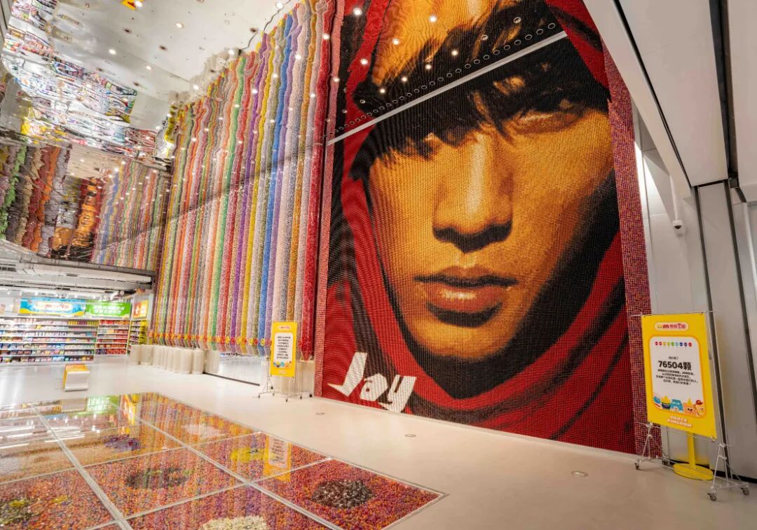 以棒棒糖墙为例,这是一面由7万余根棒棒糖拼制而成的巨幅装置,复刻周杰伦经典专辑《范特西》封面,“糖果管道”则由34根透明管道构成,内部装填约50万颗真实糖果,形成强视觉冲击的场景。