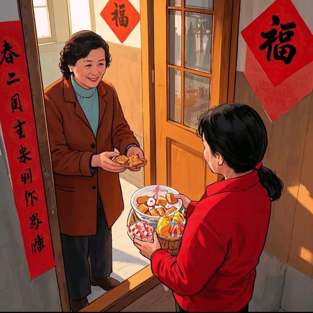正月初二“回娘家”又称“归宁”。在大年初二,女儿回娘家时,需带一些饼干、糖果,由母亲分送邻里乡亲,一如过年的情景。礼物虽薄,然而反映的情意却甚浓,真正是“礼轻情意重”,表达了姑娘对乡亲的切切思念。