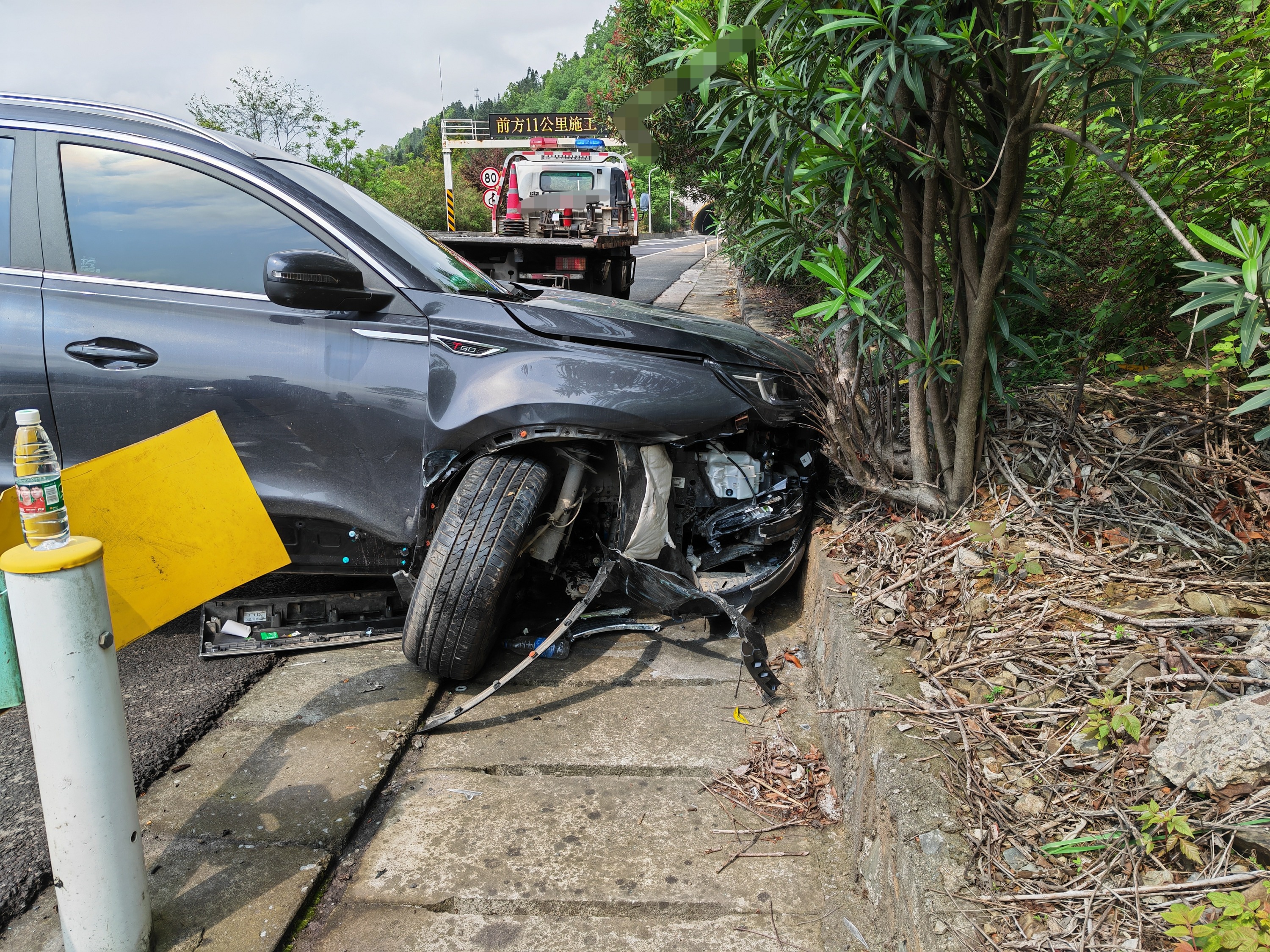 经民警现场勘查及调取行车记录仪视频了解到,当时驾驶员邹某杨驾驶号牌为粤S80Q8K黑色小型普通客车正沿快车道正常行驶。突然,小车行驶方向突然向右偏移,撞上道路右侧水泥挡墙及护栏,造成小车车头和右前轮严重受损,所幸驾驶人邹某杨及车上人员都系了安全带,没有造成人员受伤。