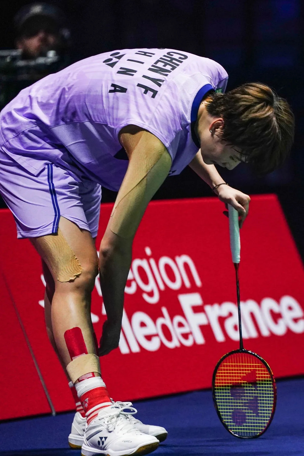 8月31日,陈雨菲在比赛中检查脚部伤势。新华社记者 彭子洋 摄