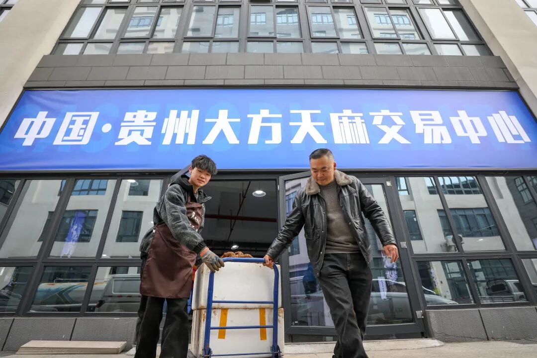 2025年12月17日,在毕节市大方天麻交易中心,客商正在搬运天麻。(何志刚 摄)