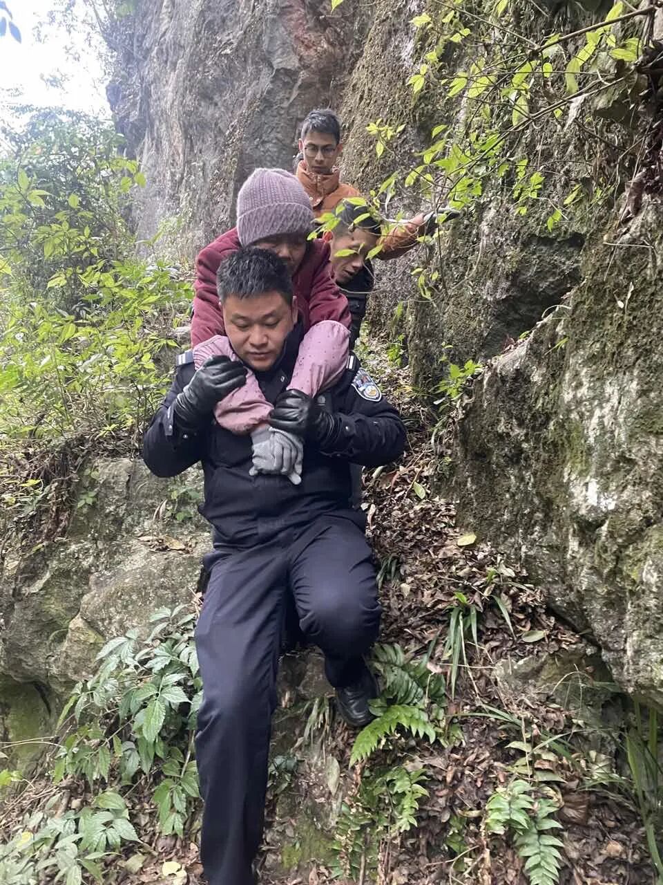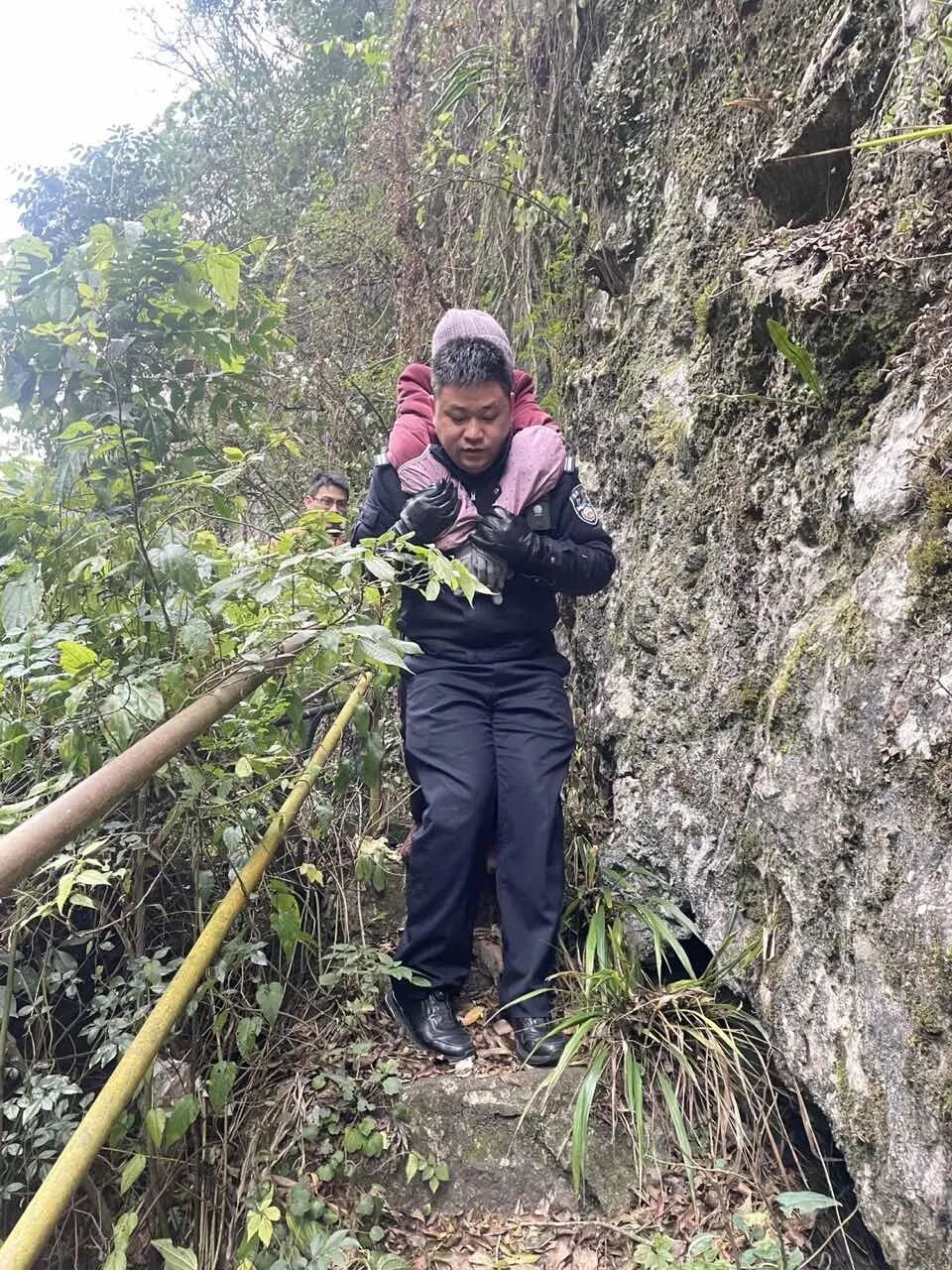民警在半山腰发现老人背着她走下陡峭的山路