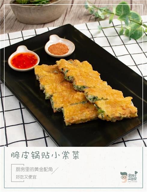 将脆皮锅贴小棠菜切成块状成盘即可,可以配上椒盐、泰国甜辣酱一起享用~