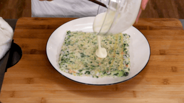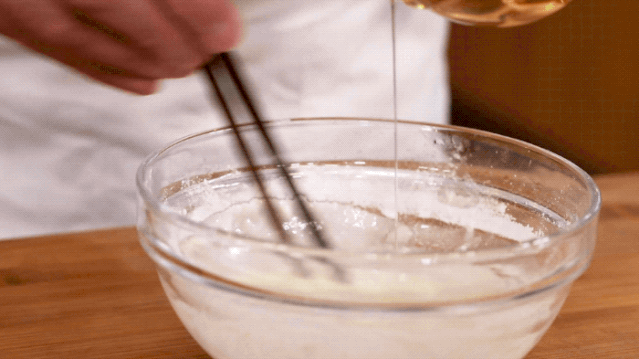 5g低筋面粉、10g生粉、5g泡打粉调脆浆粉,加水搅拌成糊,加入少量色拉油,搅拌均匀。