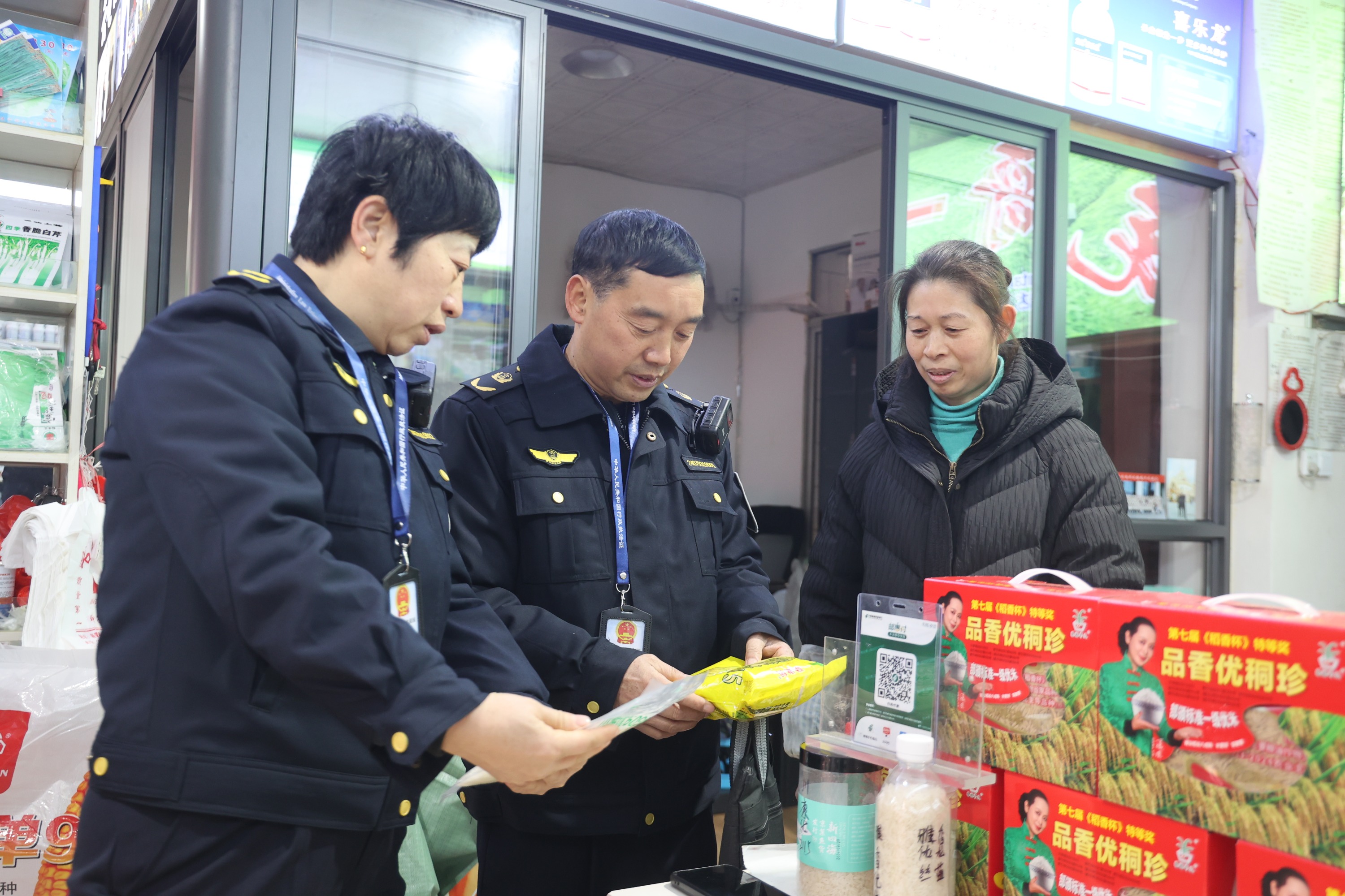 施秉县农业农村局执法大队工作人员梁芳表示:"今天是施秉县赶集日,我们主要对县城区内的农资经销商进行检查,重点检查种子、农机经营与备案销售情况,目的是让全县老百姓都能用上放心的种子和肥料。"