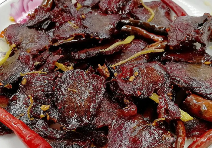 江口牛干巴:江口县牛干巴是当地传统美食,“梵净山八大土特产”之一,产自梵净山脚,深受当地人民的喜爱,是居家旅行、探亲送友的必备礼物。成品色泽暗红、闻之香欲滴、入口肉酥味酣。