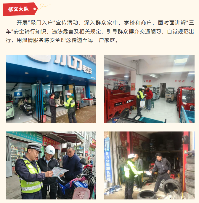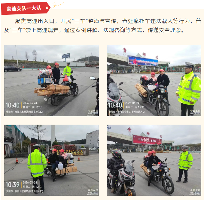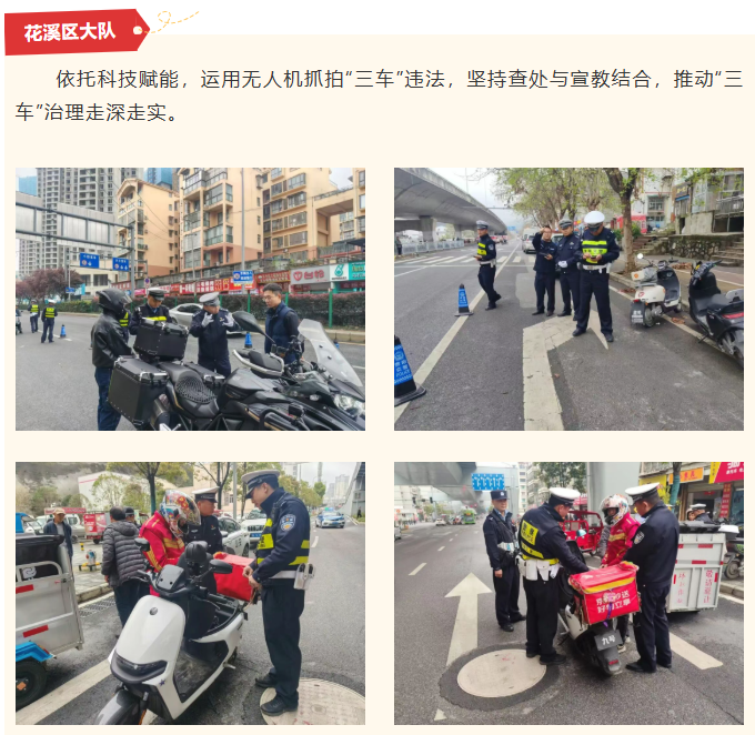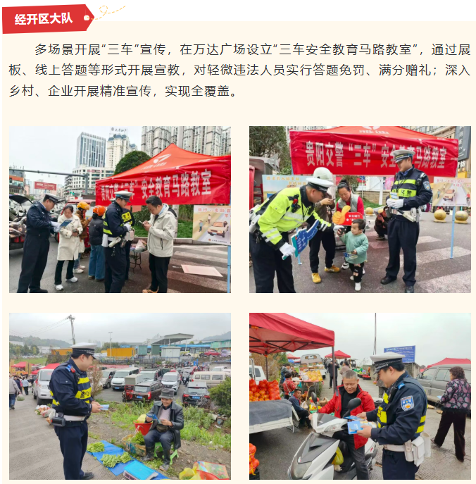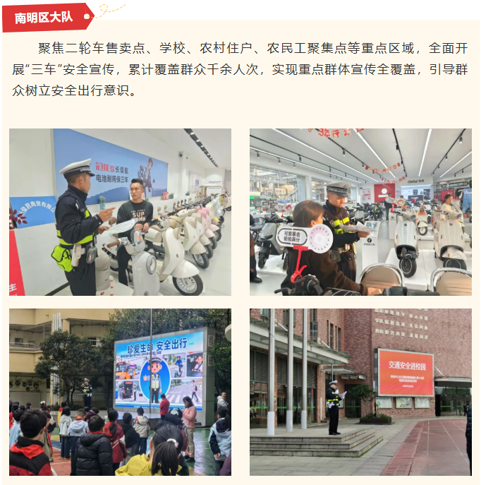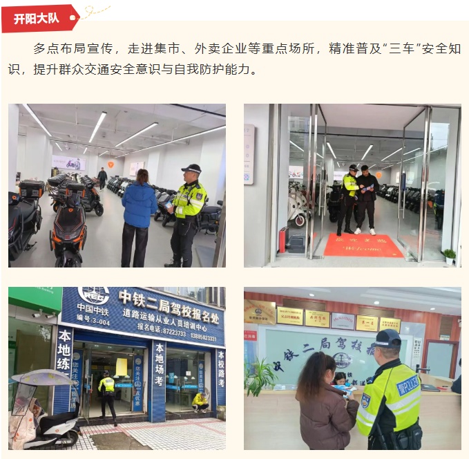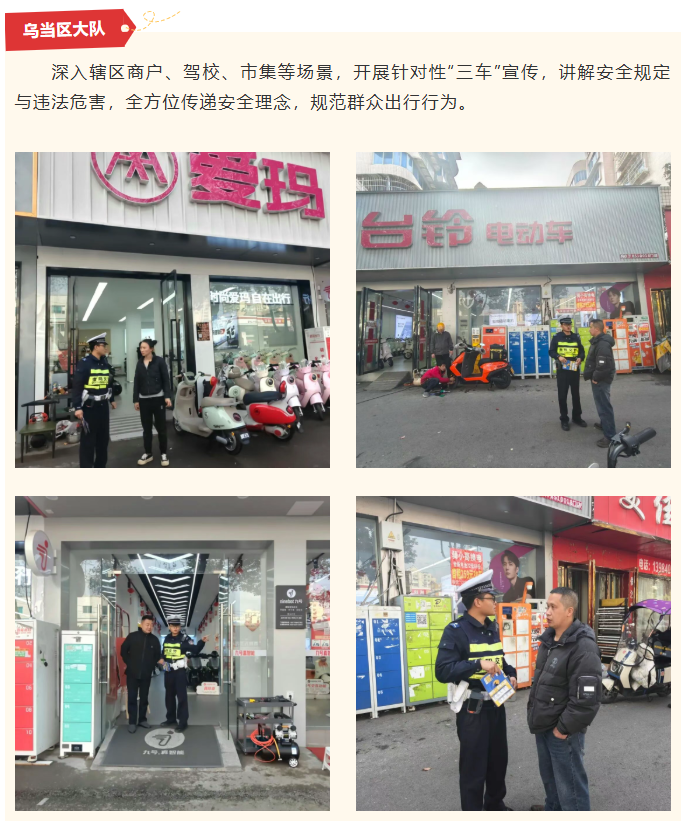 为持续净化辖区道路交通环境,防范化解“三车”安全隐患,有效预防和减少涉“三车”交通事故,守护群众出行平安,贵阳交警在全市范围内开展“三车”集中专项整治行动,坚持“整治与宣传并行、管控与服务并重”原则,聚焦企业、乡镇、校园、车辆售卖点等重点区域,组织各辖区大队及高速支队多点发力、精准施策,以权威守护、实用服务、温暖举措,将安全理念传递至每一位群众,全力保障道路交通安全有序。