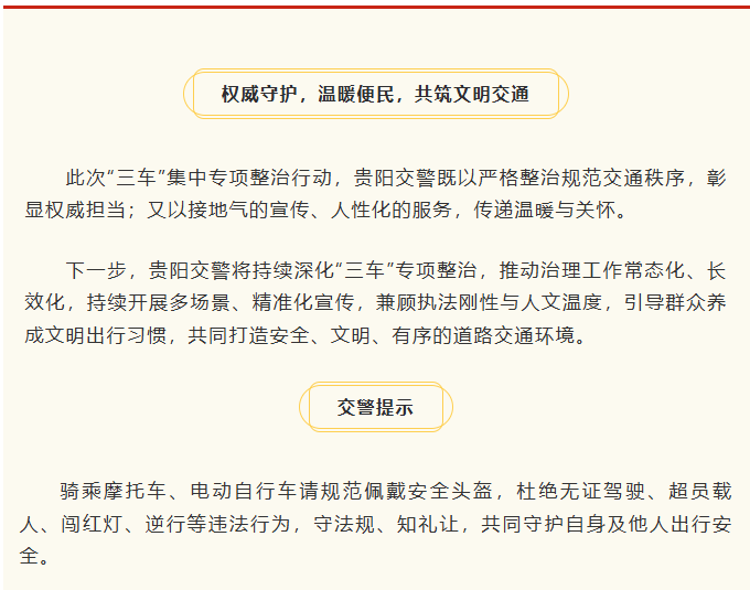 此次专项行动中,贵阳交警各大队结合自身实际,针对不同场景、不同群体开展精准宣传与整治,实现“宣传有温度、整治有力度”,彰显责任与担当。