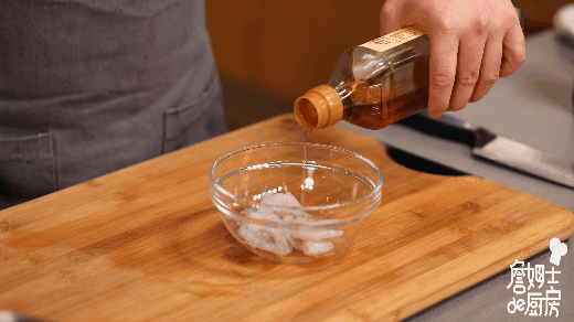 虾仁用料酒、香油抓拌均匀腌制备用。