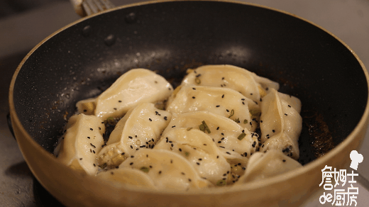 1.平底锅底部刷油放入锅贴煎至淡淡的金色、小火倒入适量面粉水,盖上盖焖至面粉水收干,倒入少许葱姜蒜油,中火焖两分钟上色后,撒上黑芝麻、葱花。