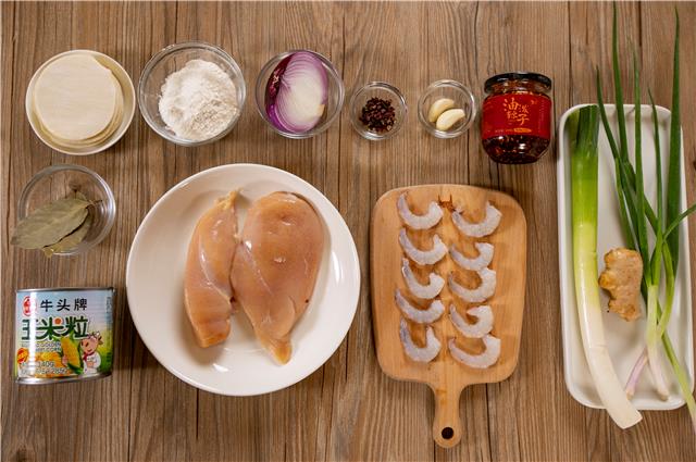 鸡胸切块绞成肉碎,放入1比1的盐、胡椒、料酒、100g葱姜蒜油拌匀后放入玉米粒、虾仁备用。
