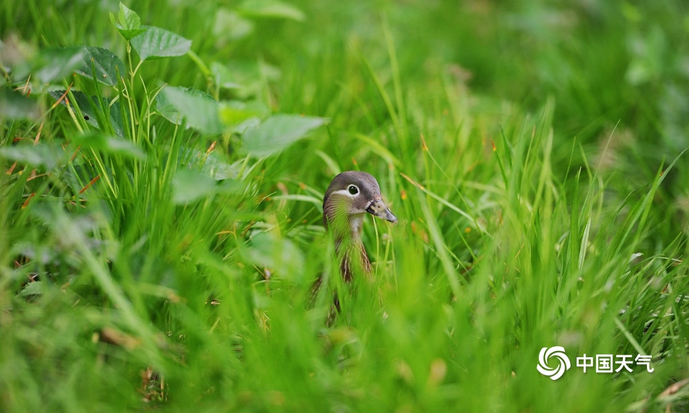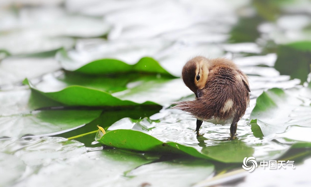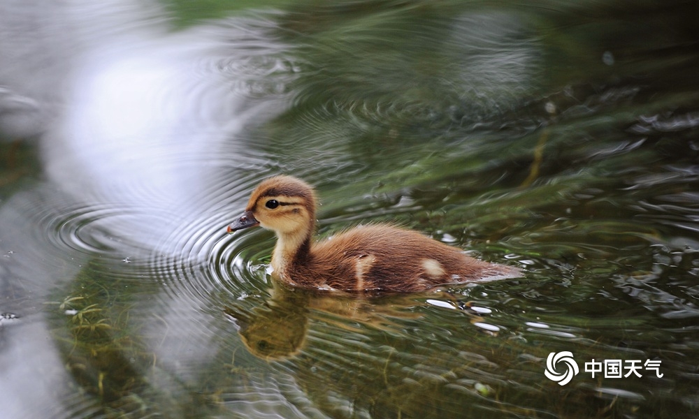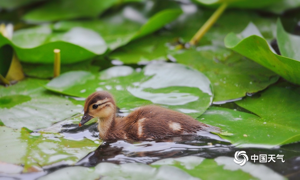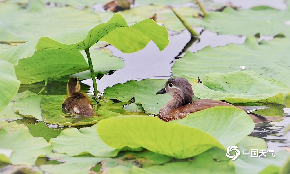 中国天气网讯 夏日里,北京紫竹院公园的水塘里充满生机,鸳鸯妈妈与小宝宝不时在水面觅食休憩。鸳鸯宝宝毛色还不如妈妈那般靓丽,稚气未脱。(图/中国天气网 王晓)