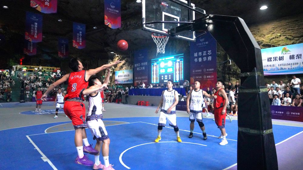 “加油!加油!”抵达凤鸣洞前,耳畔传来的是解说员和观众的助威声。记者从洞口处可以看到,洞顶布满了高悬的彩带和洒下亮光的一排排大灯,正中间的篮球场上选手们正在激烈对抗,四面的看台坐满了观众。