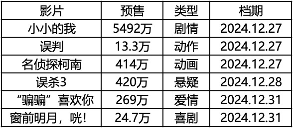 紧接着《小小的我》也如期而至,迅速提档至2024年12月27日13点,抢在更前端。说明今年的跨年大战其实从2024年12月27日就已经提前打响。