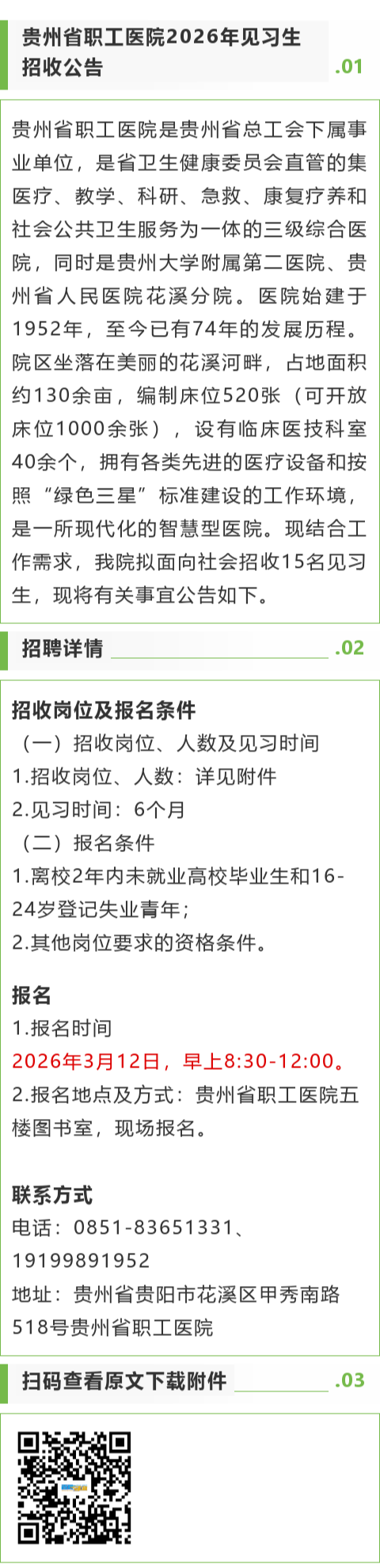 【事业单位】贵州省职工医院招聘见习生!报名截止时间:3月12日!