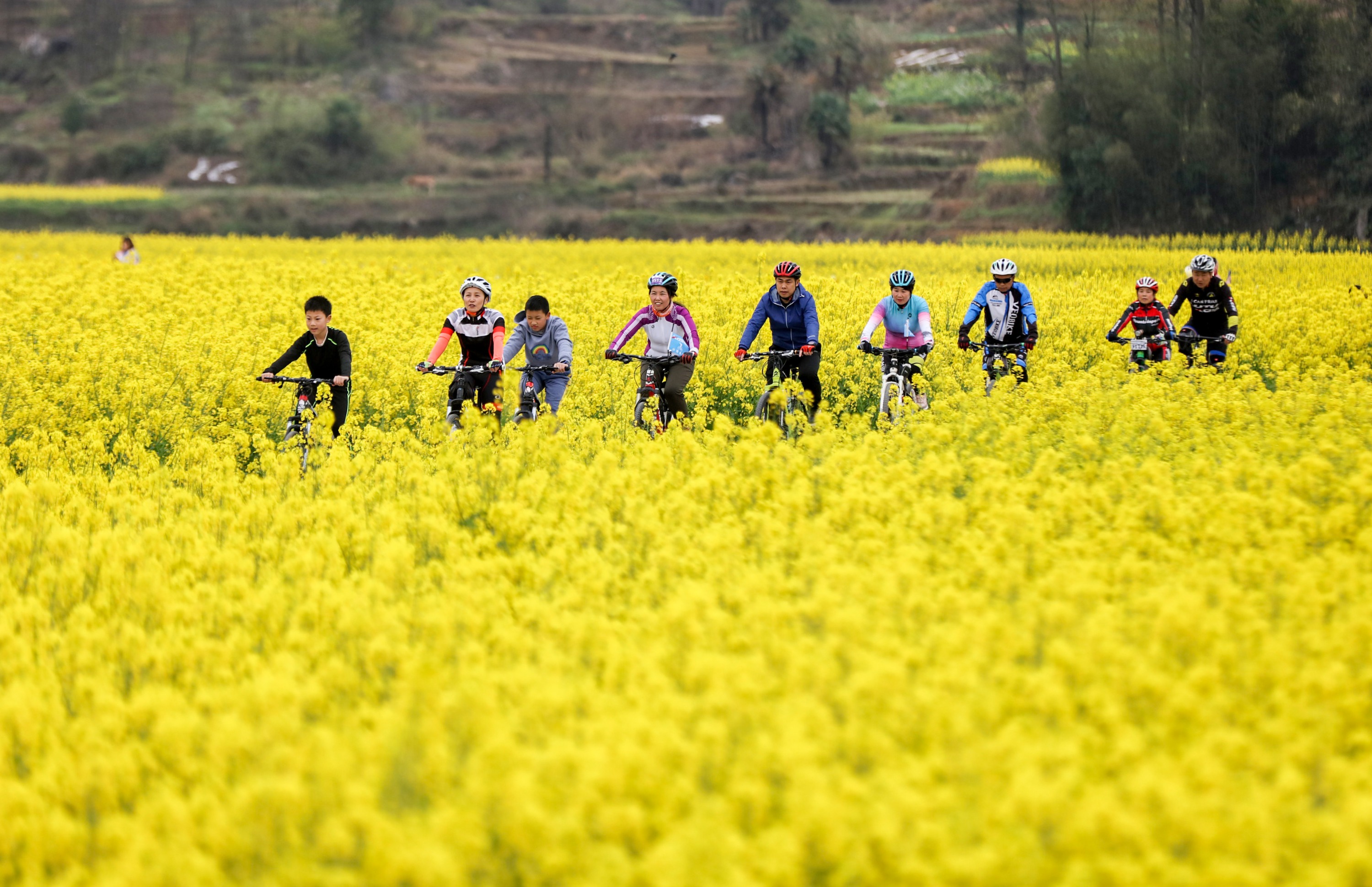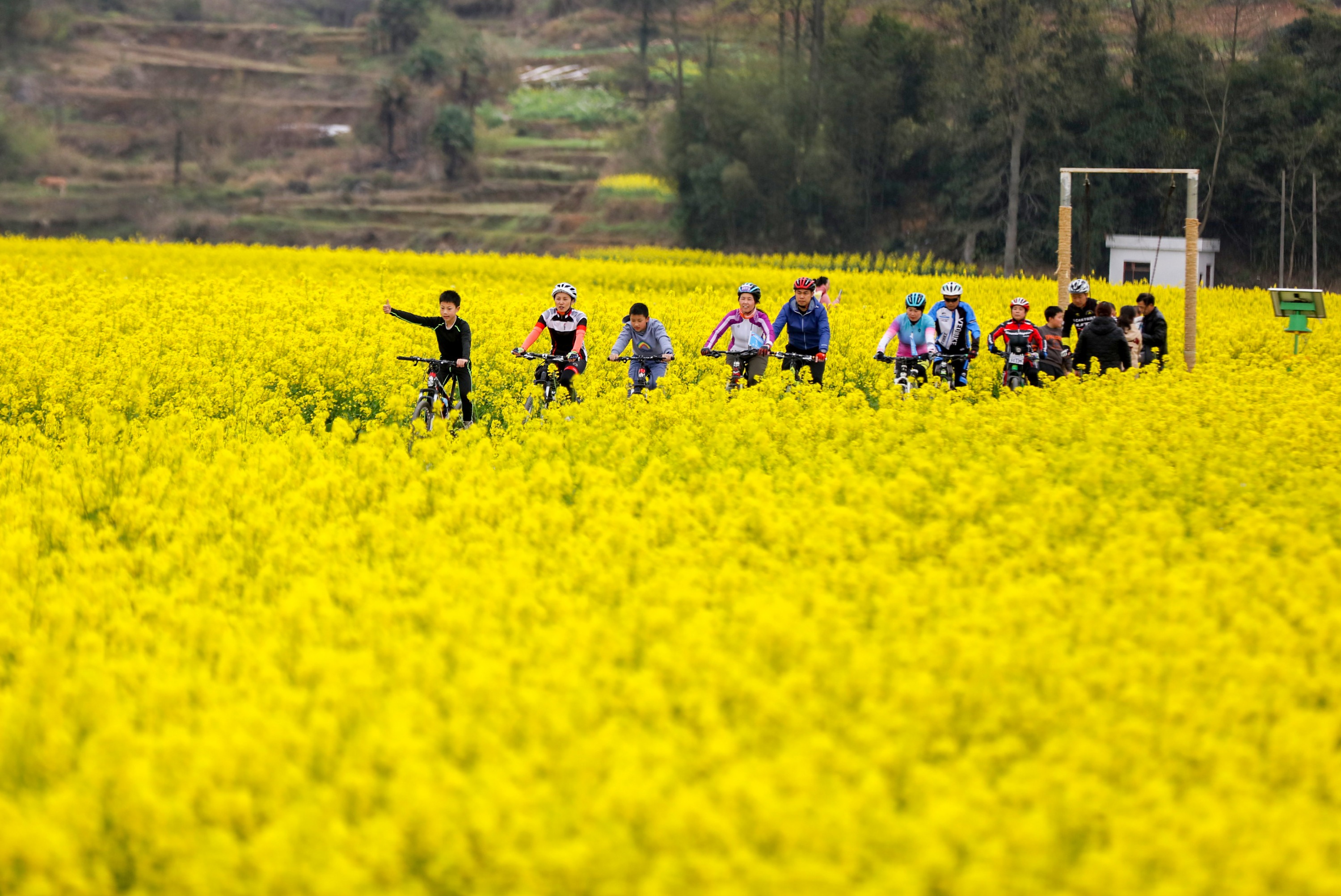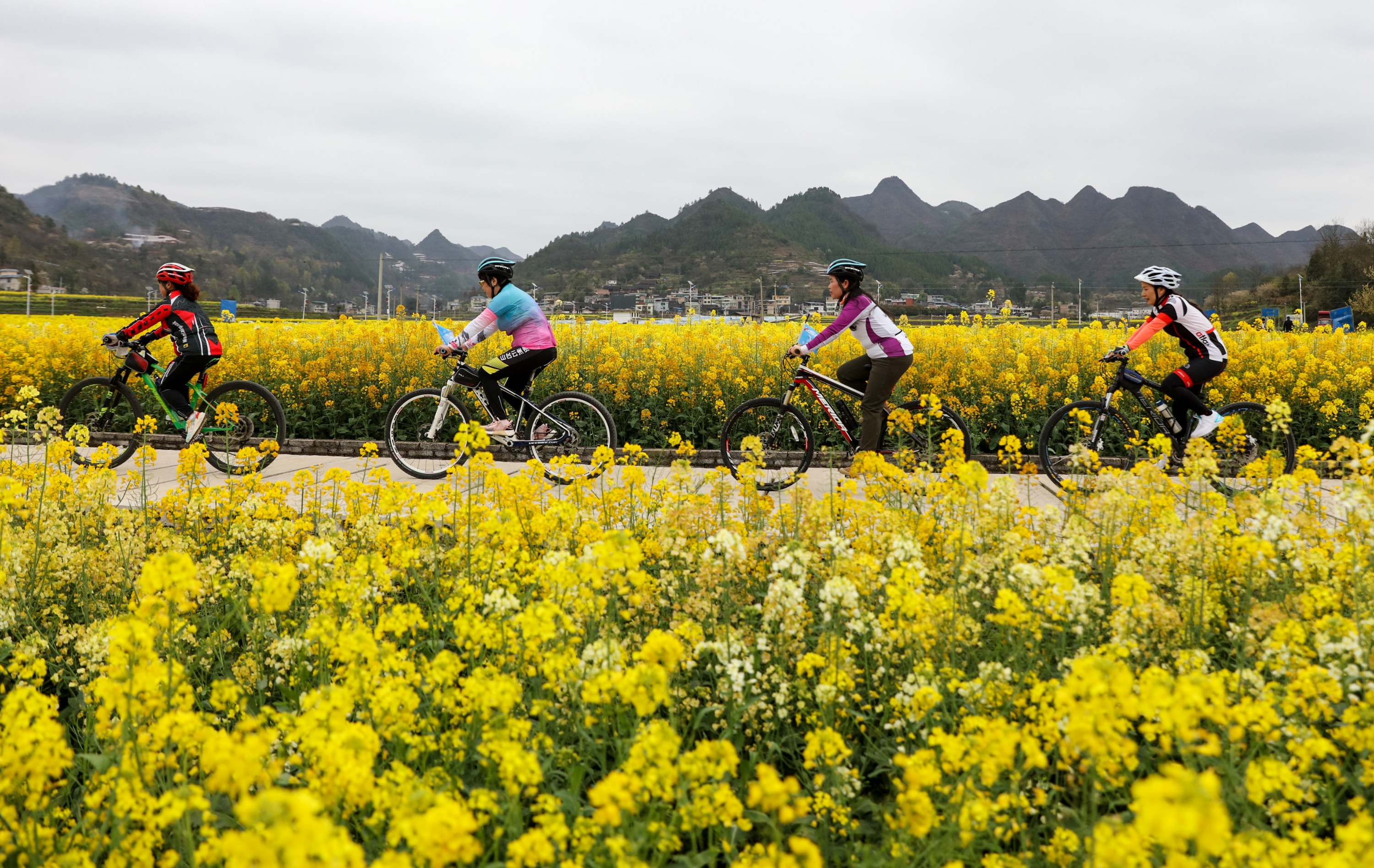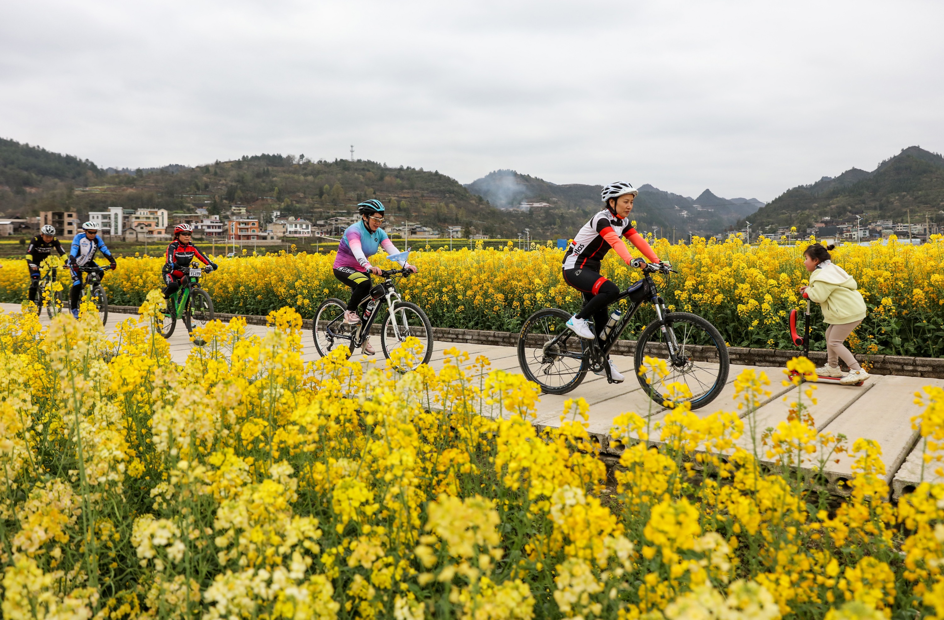 近日,贵州省黔东南苗族侗族自治州施秉县城关镇上翁哨村上千亩油菜花盛开,吸引众多骑行爱好者前来骑行赏花,领略田园春色,享受运动快乐。