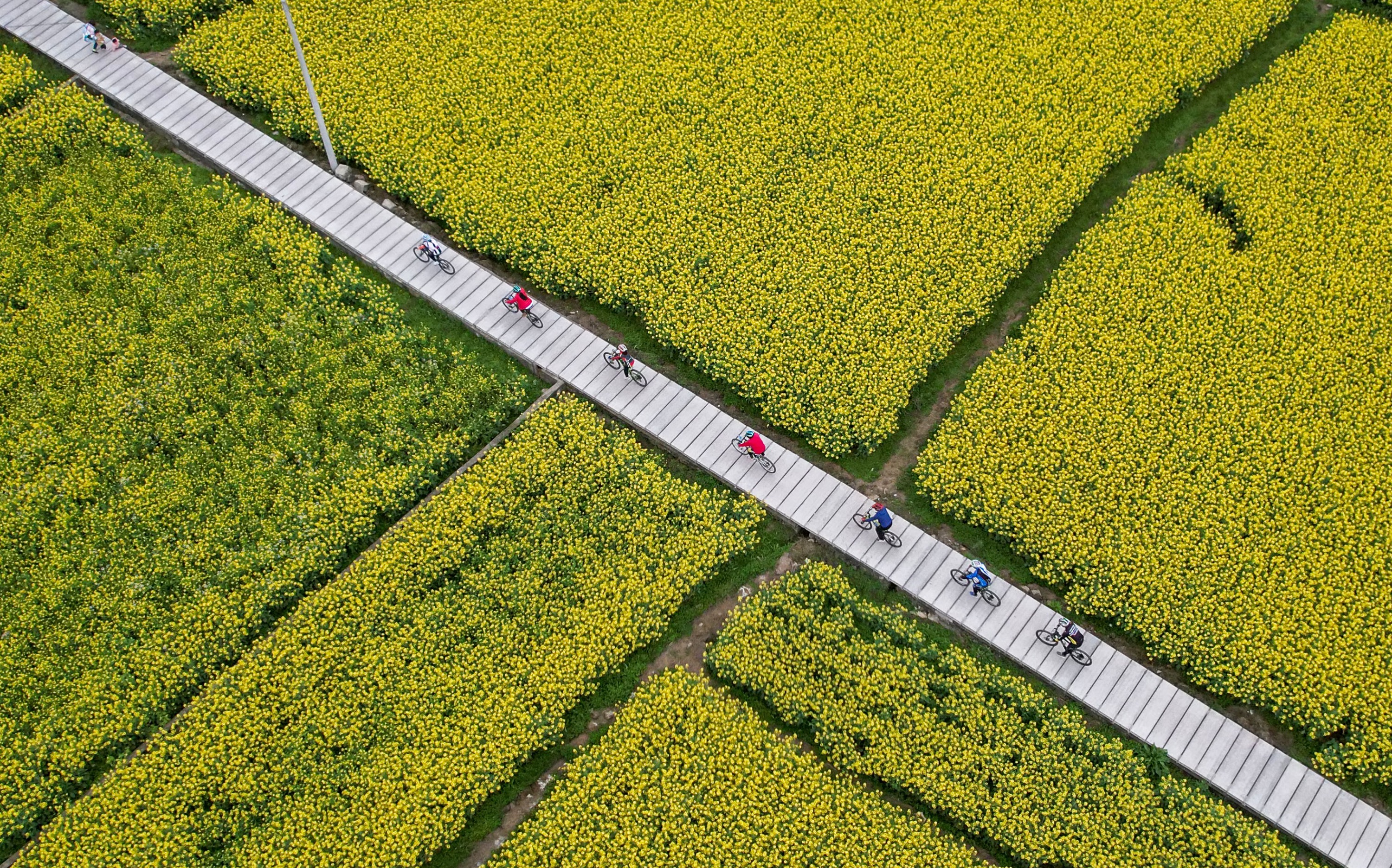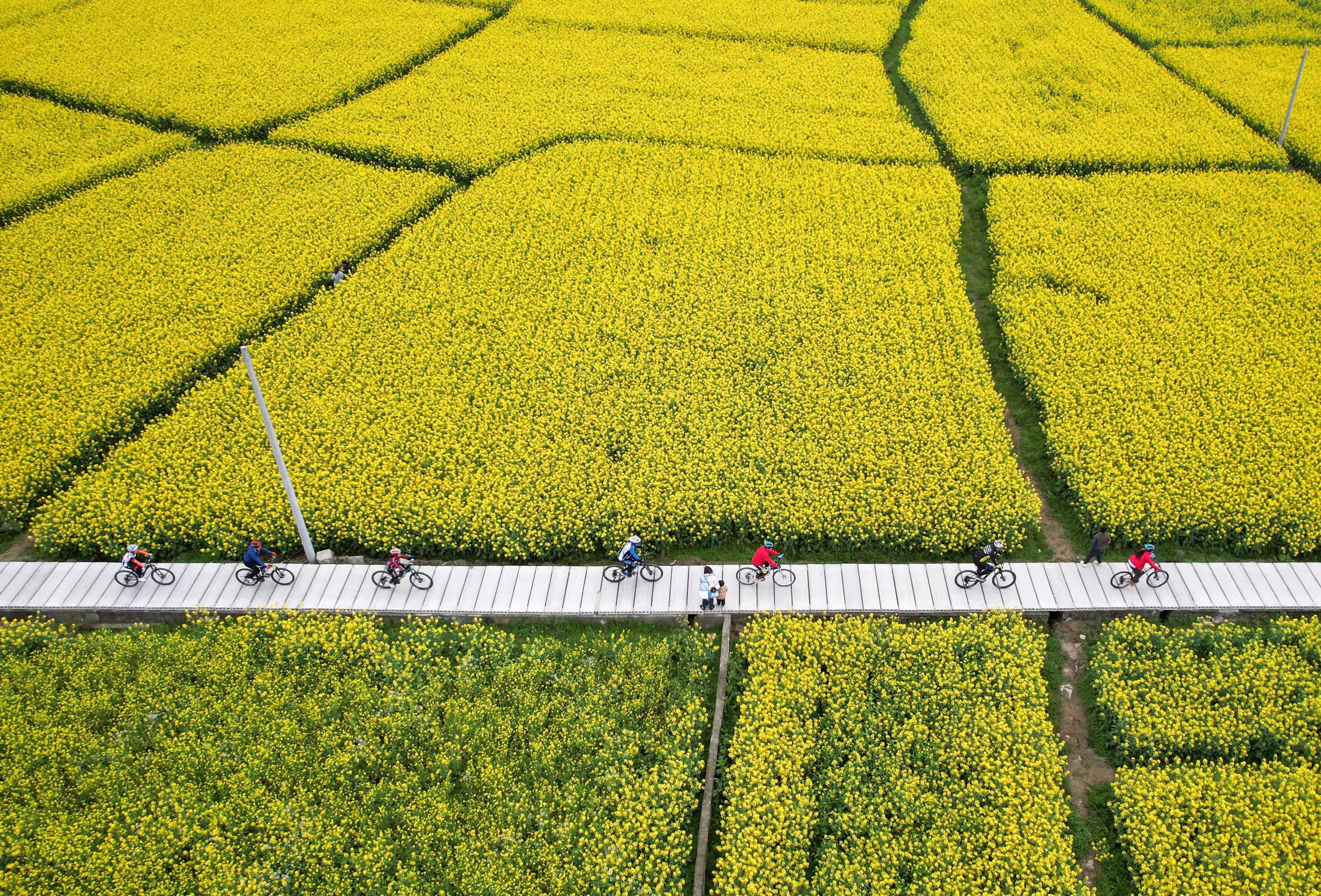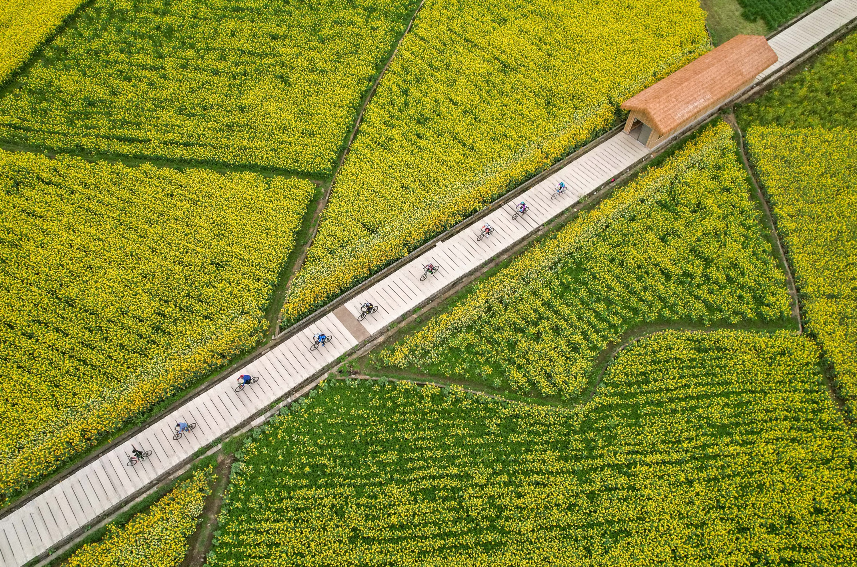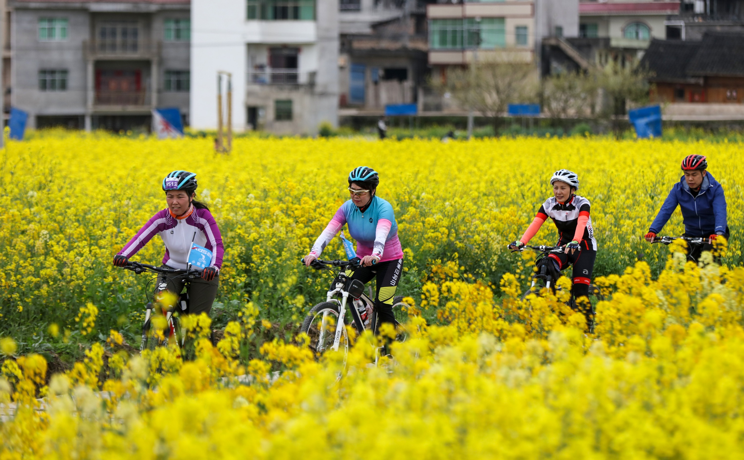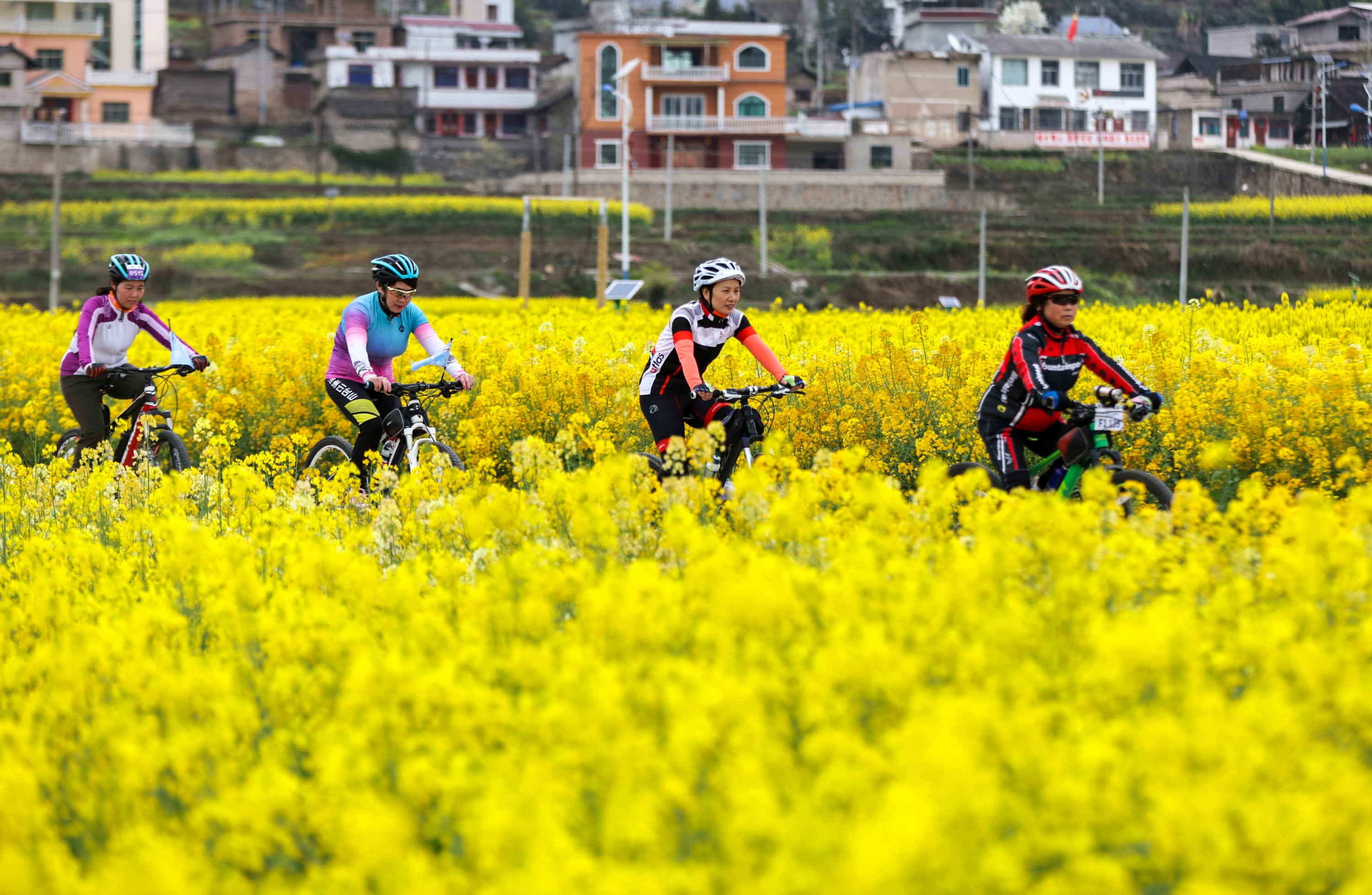近日,贵州省黔东南苗族侗族自治州施秉县城关镇上翁哨村上千亩油菜花盛开,吸引众多骑行爱好者前来骑行赏花,领略田园春色,享受运动快乐。