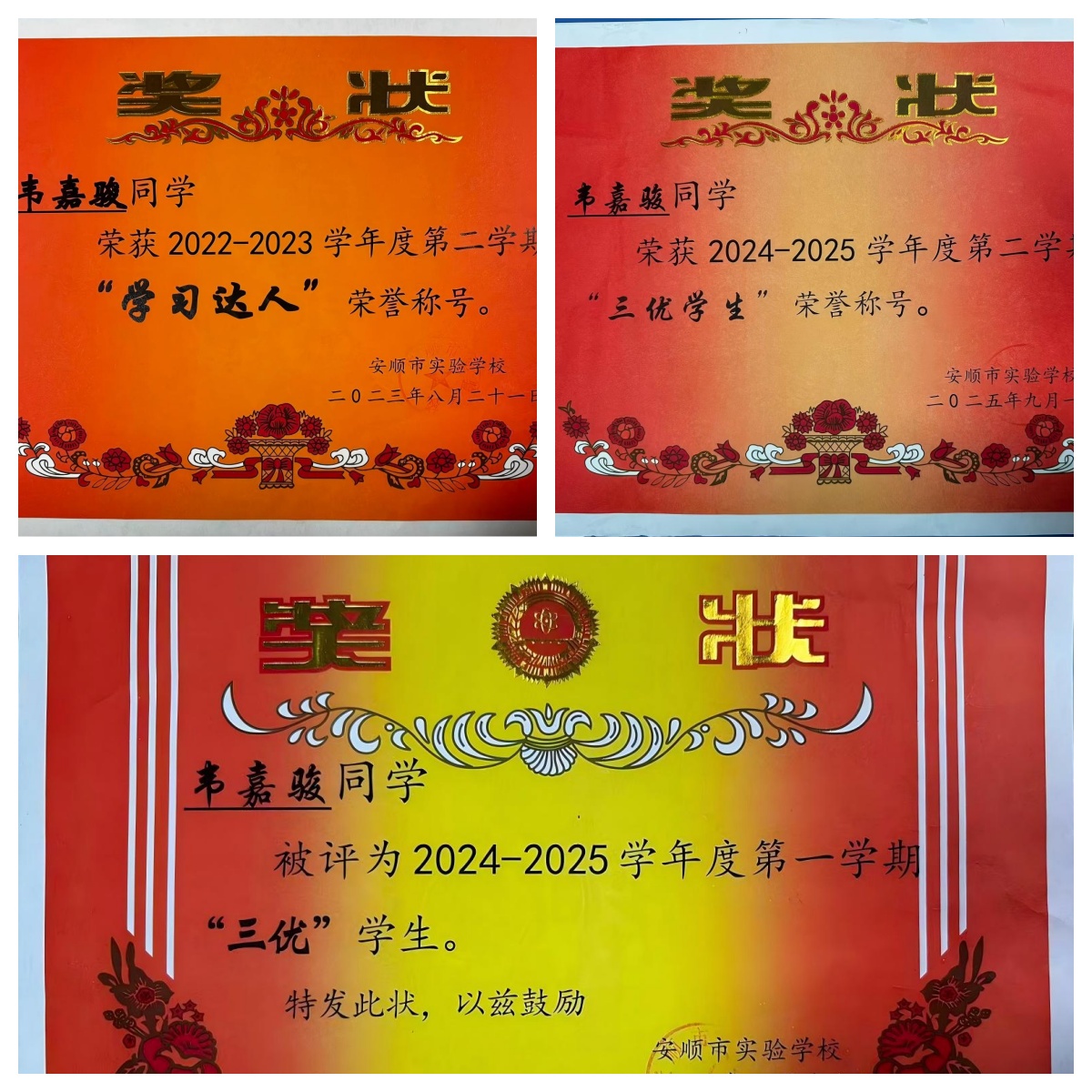 我曾获得安顺市“新时代好少年·强国有我”主题教育朗诵比赛市级一等奖,也被评为校级“三优学生”和“学习达人”。这些认可对我来说,不仅是荣誉,更是督促我不断向前奔跑的动力。