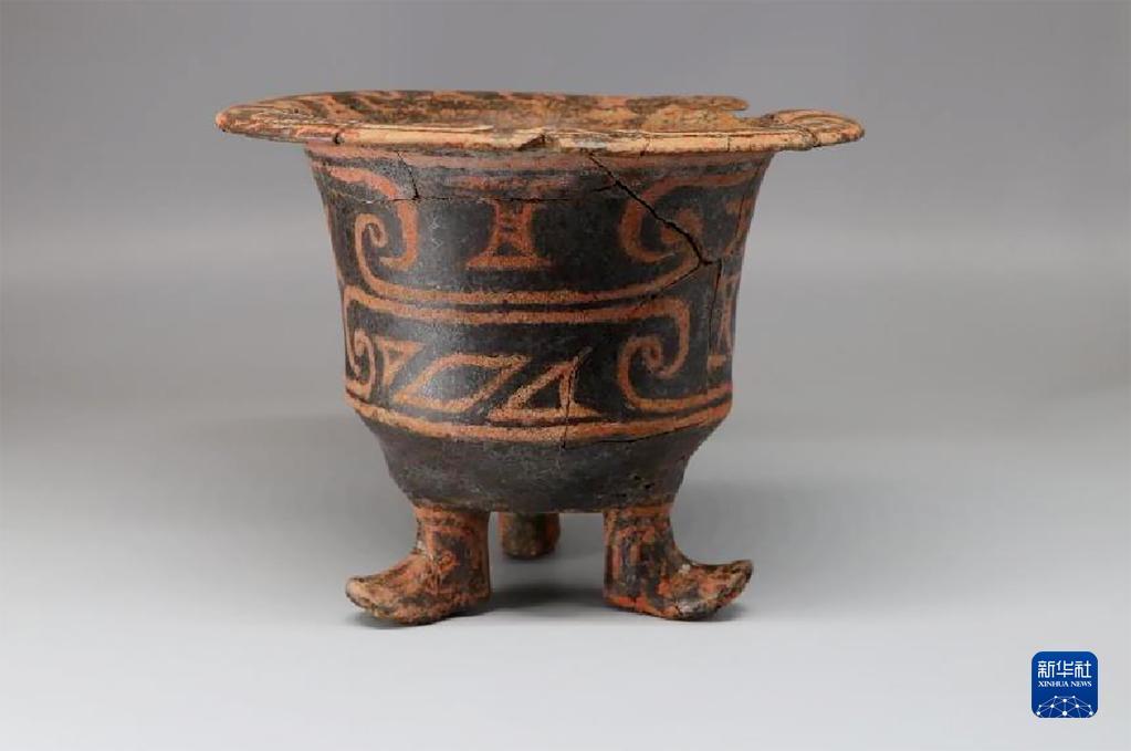 北京丰台新宫遗址大坨头文化墓葬M75出土的靴形足彩陶尊。新华社发(国家文物局供图)