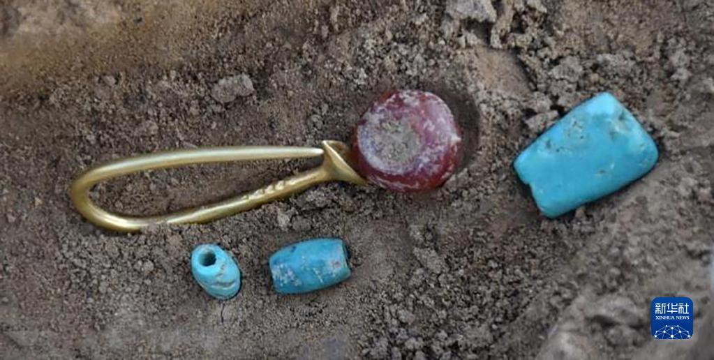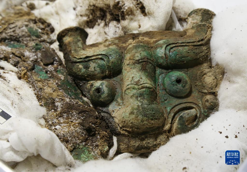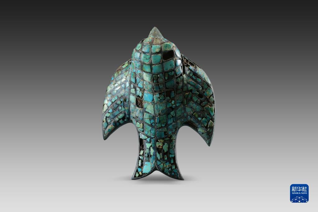 这是陕西清涧寨沟遗址发现的绿松石铜鸟饰。新华社发(陕西省考古研究院 供图)