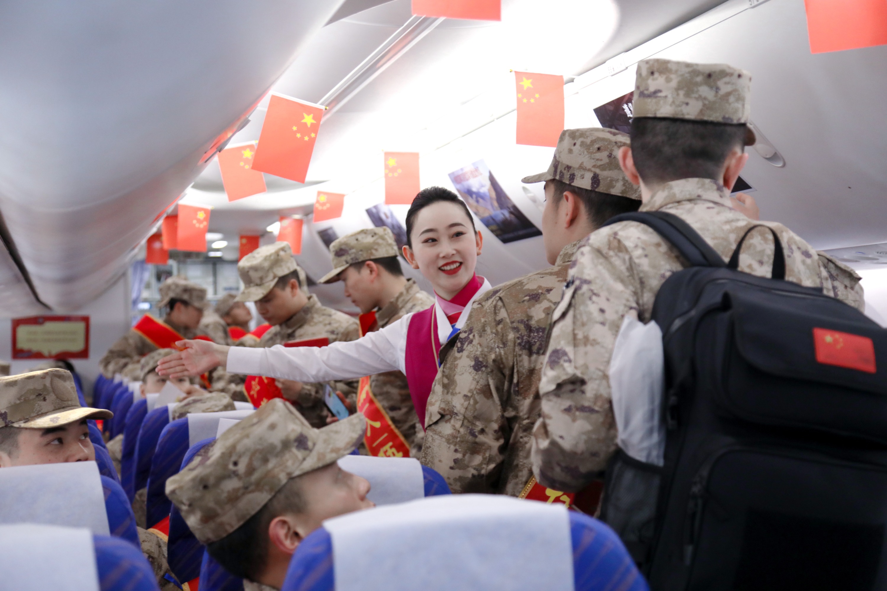 登机后,新兵们惊喜地发现,南航贵州公司乘务组提前进场布置,在行李架上插满小红旗,舷窗还贴有“纪念长征胜利90周年”主题海报,与地面“红飘带”活动遥相呼应。