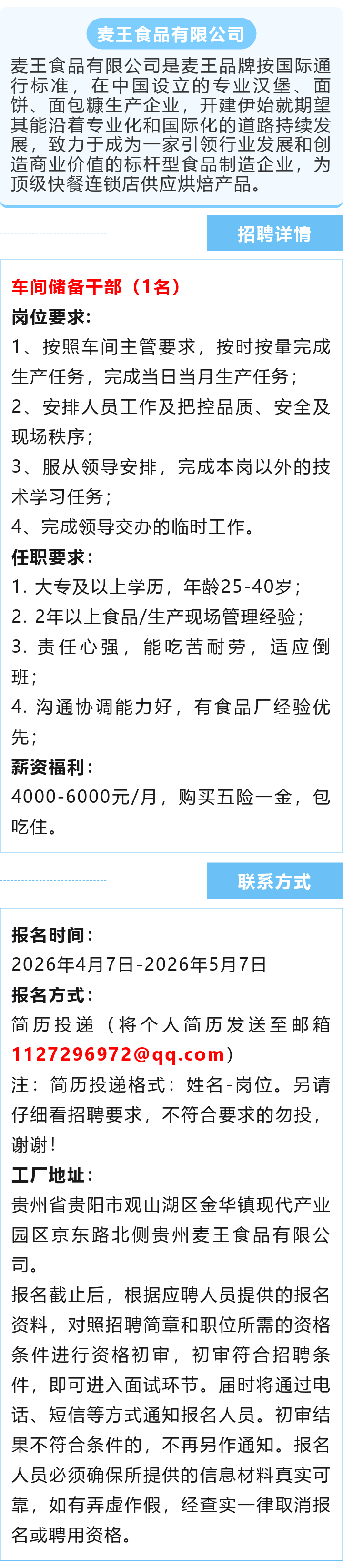 【知名企业】麦王食品有限公司招聘!月薪4000~6000元!五险一金!包吃住!
