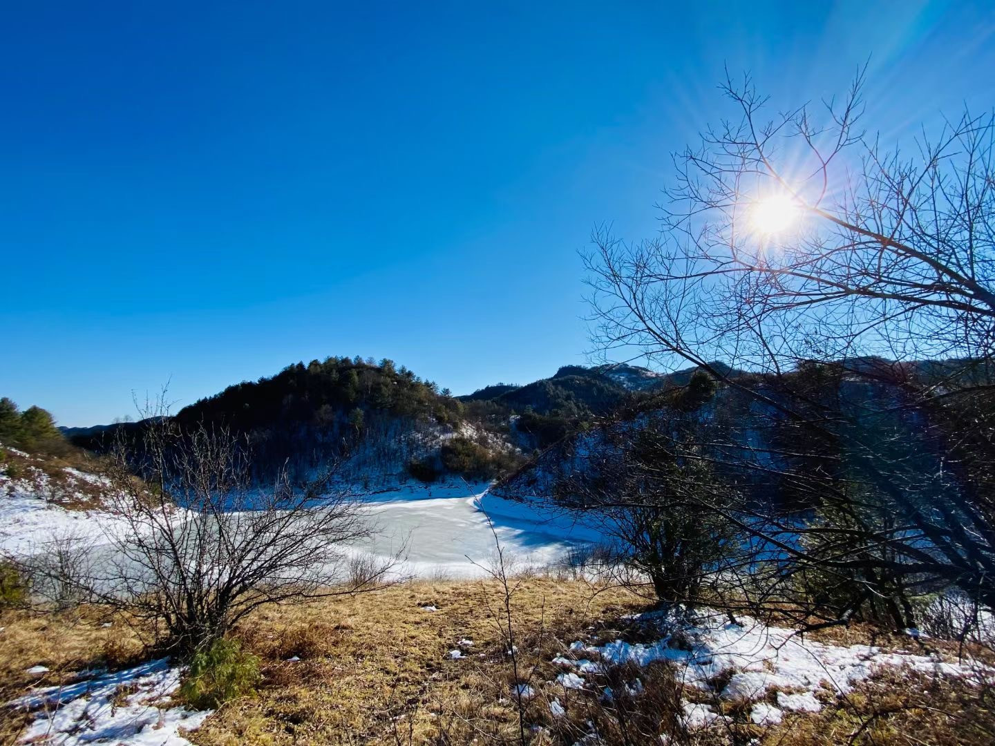 阳光洒在冰封的湖面上,晶莹透亮的冰面,与蔚蓝的天空一起,构成了干净清澈的冬日画卷。图为重庆城口黄安坝景区。(王超 摄)