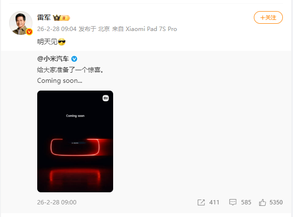 据悉,小米汽车官方微博当天发文称,“给大家准备了一个惊喜”。小米创始人、董事长兼CEO雷军转发该条微博并配文“明天见”。