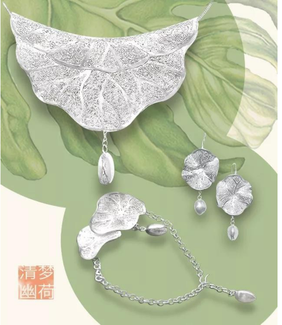 “最初我想做一个荷花的主题, 有了造型之后, 就要去研究怎么用我们的工艺来合适的表达荷叶的质感。师傅做好了叶脉, 用传统的花丝工艺来编织填充, 因为花丝的纹路太过复杂, 做出来总觉得差一点味道, 没有荷叶的感觉, 所以我突发奇想, 能不能把银丝搅乱填充在里面, 做成一种肌理感, 经过了多次实验才有了最终的造型。这是我们创新工艺: 乱丝工艺的研发过程。此工艺也获得了发明专利。一个有突破性的设计不是一蹴而就的, 是经过很多次的观察和研究, 经过了反复的实验才得到的最好的效果。”