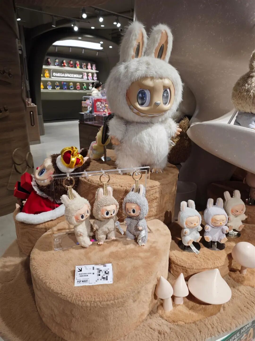 记者核实了店内各类产品价格,盲盒类产品单价多为59元、69元、79元,与官方定价完全一致;搪胶玩偶、手办等中高端产品,价格从几百元到上千元不等,也未出现任何降价调整。