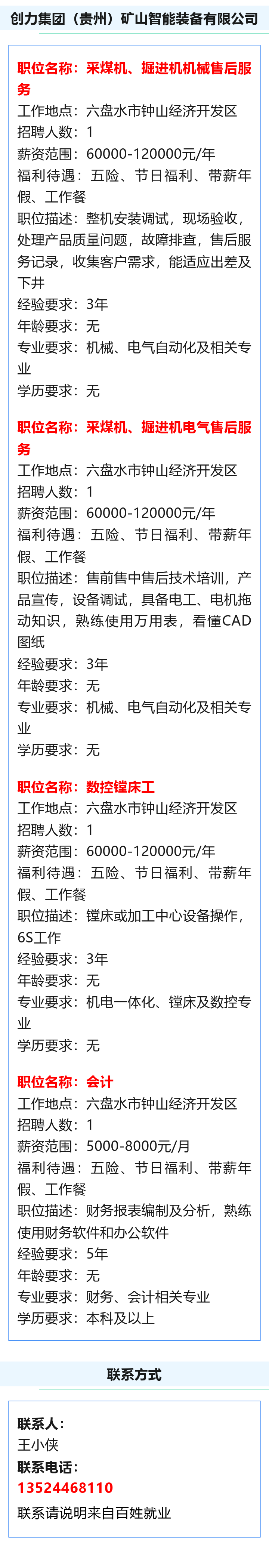 创力集团(贵州)矿山智能装备有限公司招聘!年薪6万~12万!
