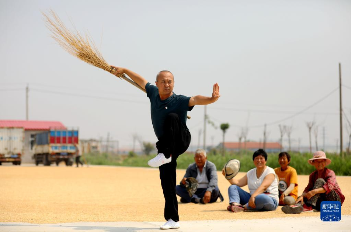 6月11日,河北省沧州市新华区小赵庄乡孙庄子村村民韩福升(左一)在晒麦场用农具扫帚表演“春秋大刀”。新华社发(周洋摄)
