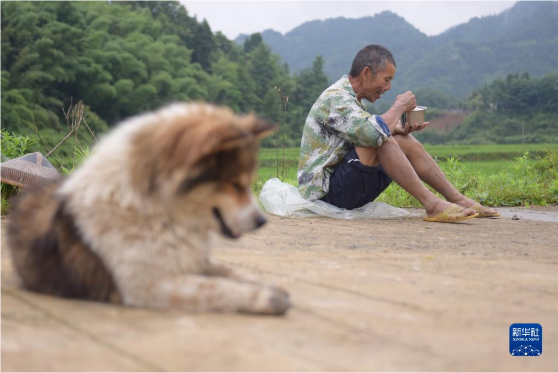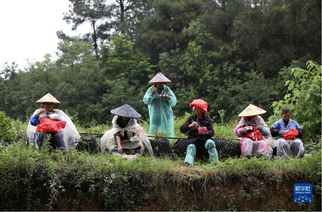 6月10日,在贵州省黔东南苗族侗族自治州岑巩县思旸镇盘街村,村民在插秧间隙吃饭。新华社发(唐鹏摄)
