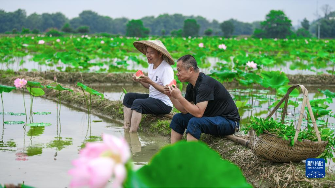 6月11日,湖南省常宁市罗桥镇三联村农民在莲田旁吃西瓜。新华社发(周秀鱼春摄)