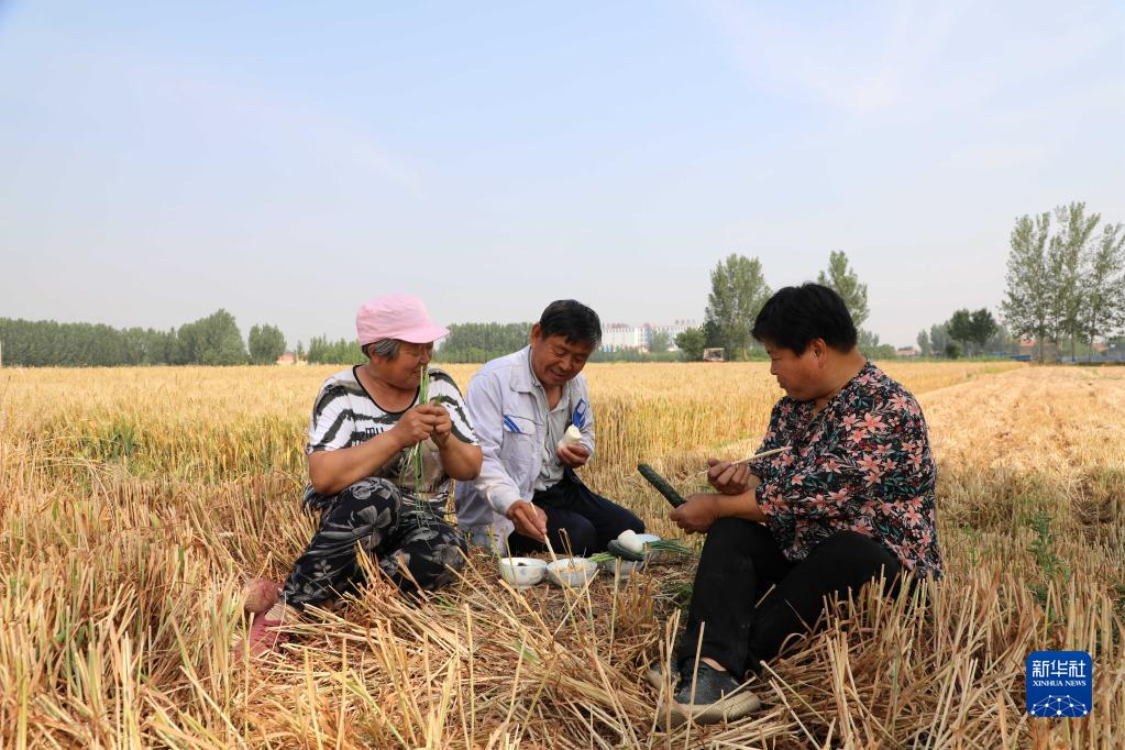6月11日,山东省滨州市惠民县桑落墅镇农民杨存清(中)一家利用麦收间隙在田间地头吃早饭。新华社发(初宝瑞摄)