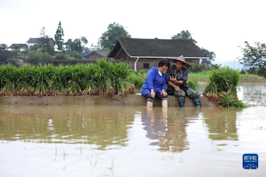 6月10日,在贵州省黔东南苗族侗族自治州丹寨县兴仁镇烧茶村,村民整理秧苗间歇,坐在水田旁观看手机视频。新华社发(黄晓海摄)