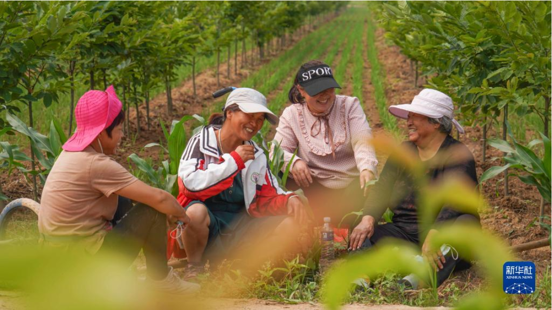 6月11日,河北省遵化市新店子镇西苇店村几名下地干活的妇女在地头歇息唠家常。新华社发(刘满仓摄)