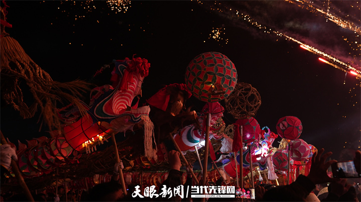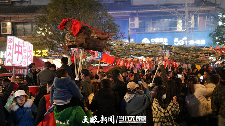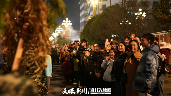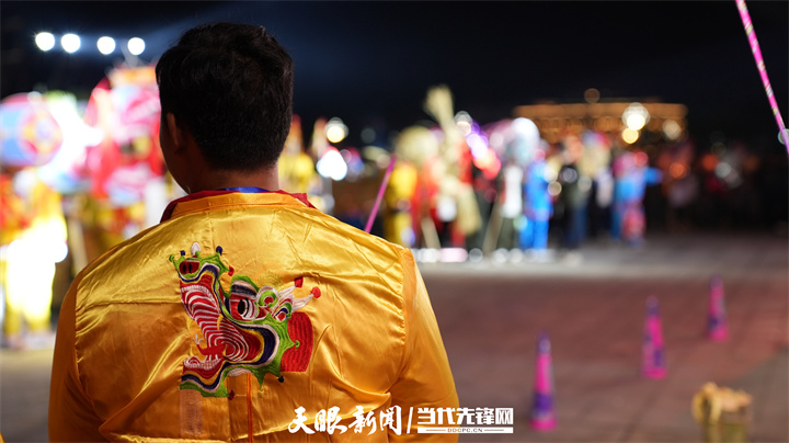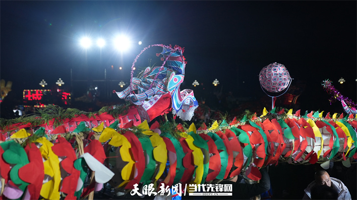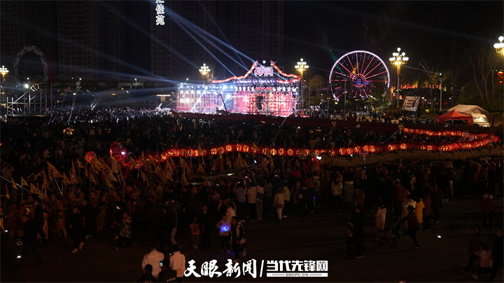 开幕式现场,2条长108米的大型亮龙、草把龙,138条其他各型亮龙、草把龙惊艳亮相,万人巡游队伍和现场群众同闹兔年新春,现场热闹非凡、喜气洋洋。