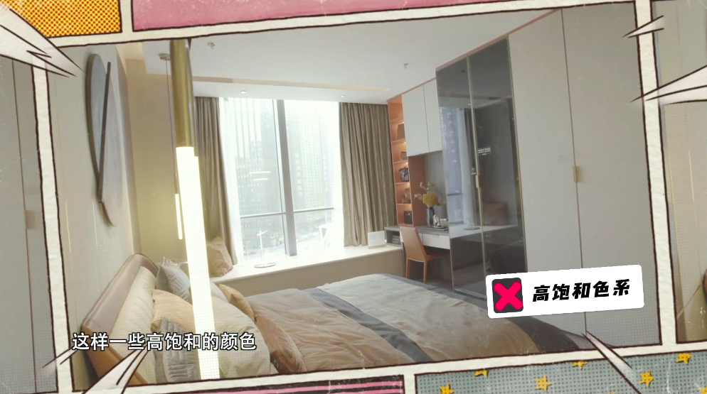 卧室要避免出现紫色,红色和粉红色等高饱和的颜色,会产生压抑感影响睡眠。